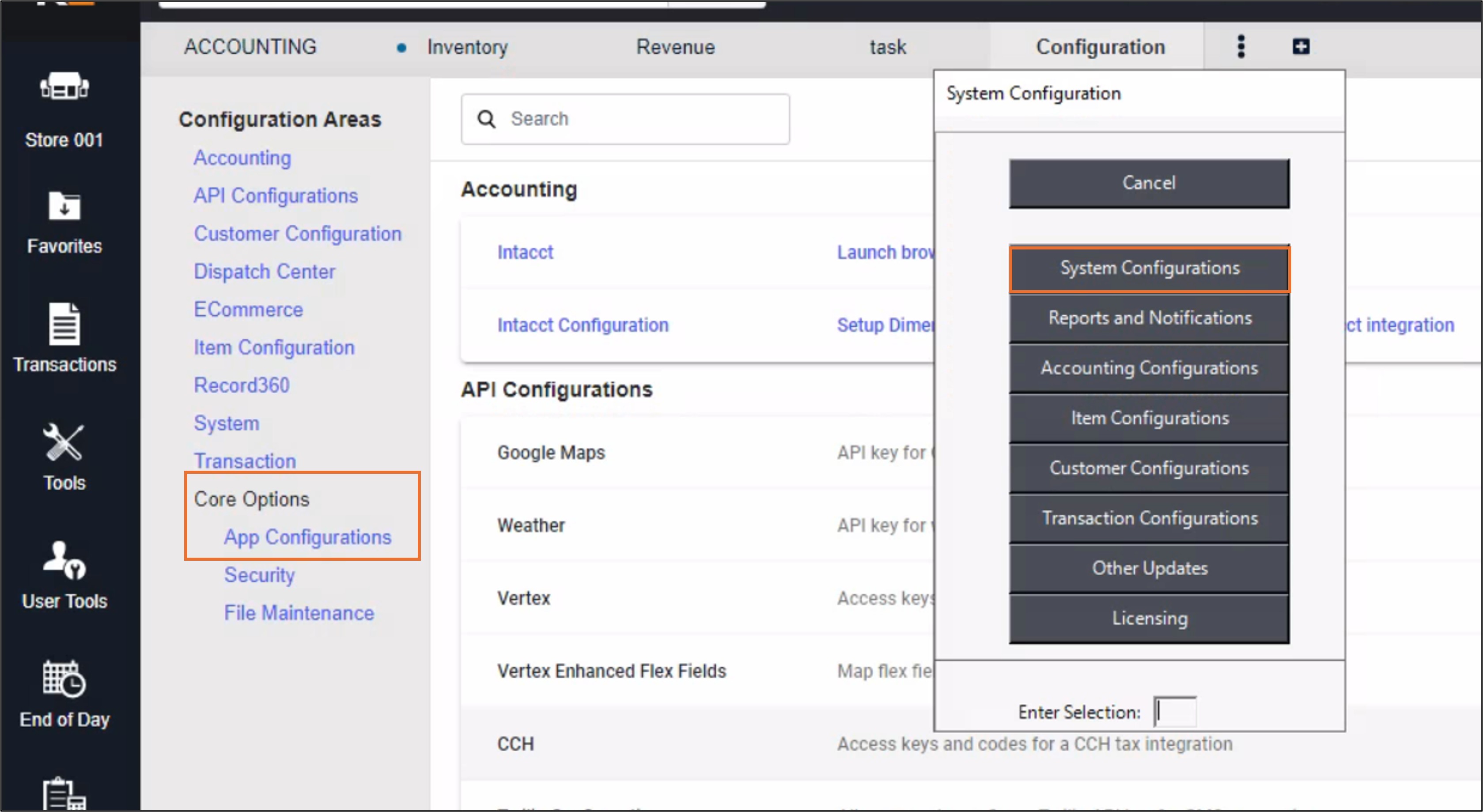 - Under Core Options, select App Configuration> System Configurations