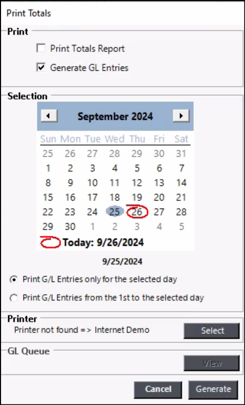 | Print GL Entries for a selected day | This will only print the GL entries for the date selected. |