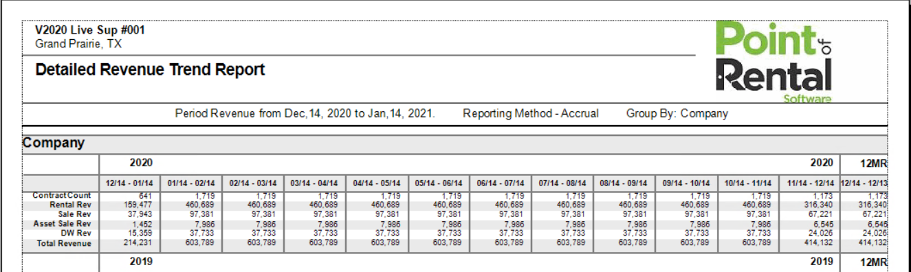 The Revenue Trend Report will show the monthly income for the last five years as well as the total for each rolling 12 months to watch for trends from year to year. The report will look like the following report:
