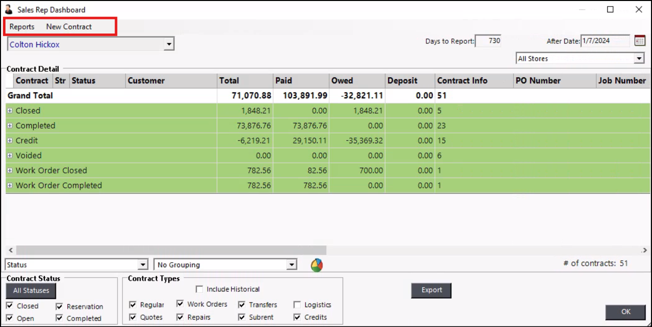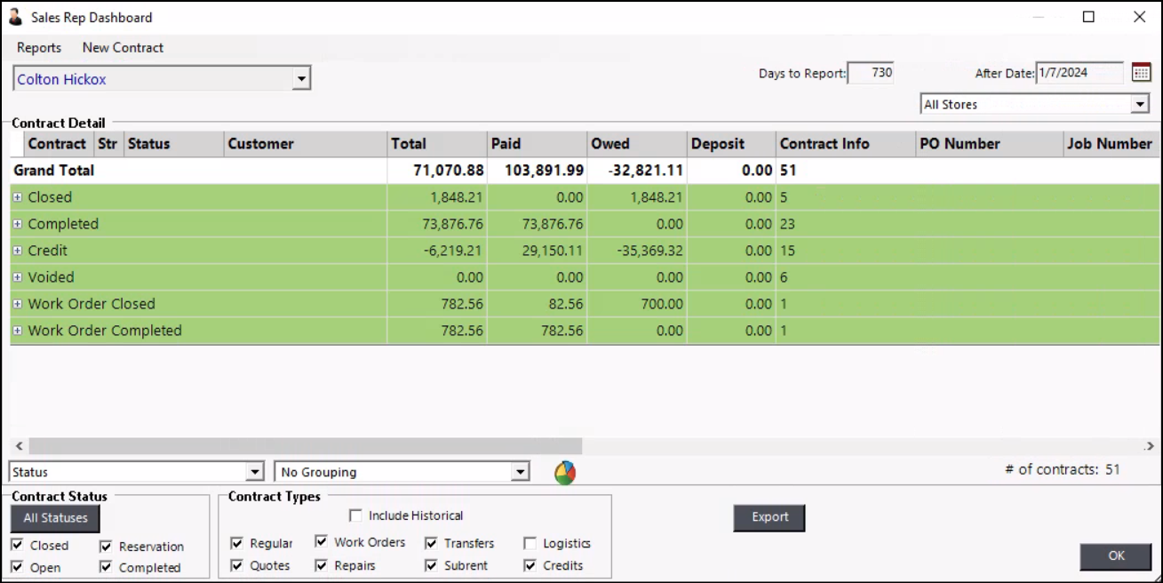 The Sales Reb Dashboard allows you to view total revenue by sales rep based on filtering by contract status, type, job site, grouping, or store location. You can look at a single sales rep or all your sales reps. The sales reps can go to the dashboard and see all their pending contracts by quotes, reservations, open, or closed. They can view the number of pending contracts at a glance or create a subgroup, grouping all the contracts by status and then by Transaction Operation.