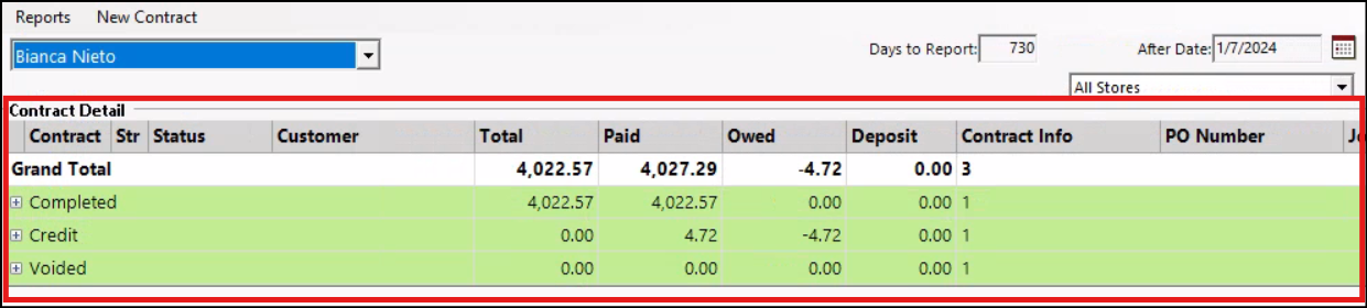 Clicking on the plus sign will display all the contracts under that sales rep. You will see the job name, total revenue for all contracts, amount paid, owed, deposits, and the total number of contracts under this sales rep.