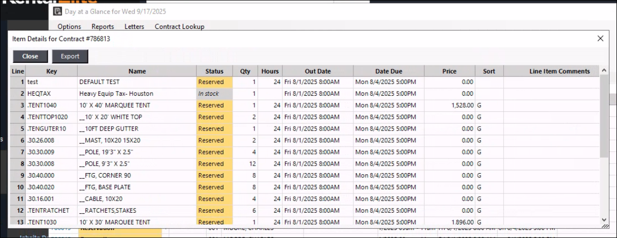 - The status of the line item will change from reservation (yellow) to out (green), and the inventory items will be removed. If any money is due on the contract, you can proceed to the payment screen to make a payment.