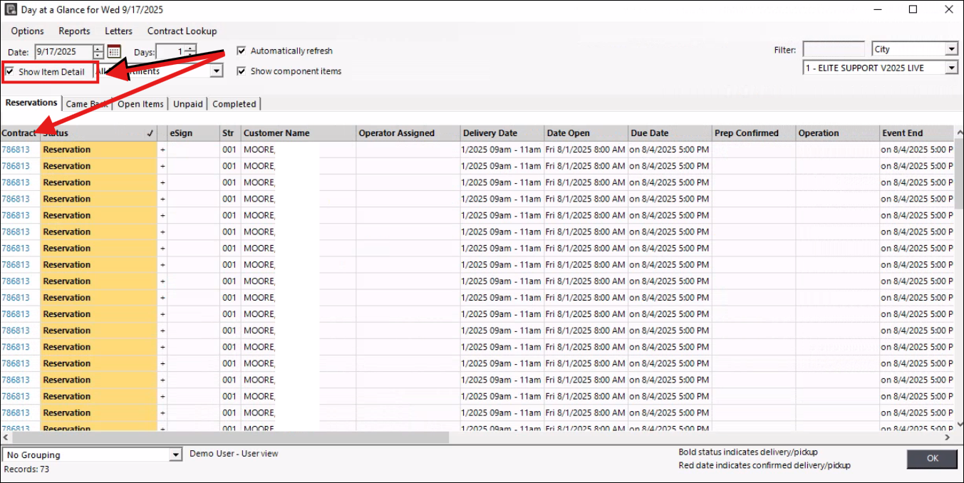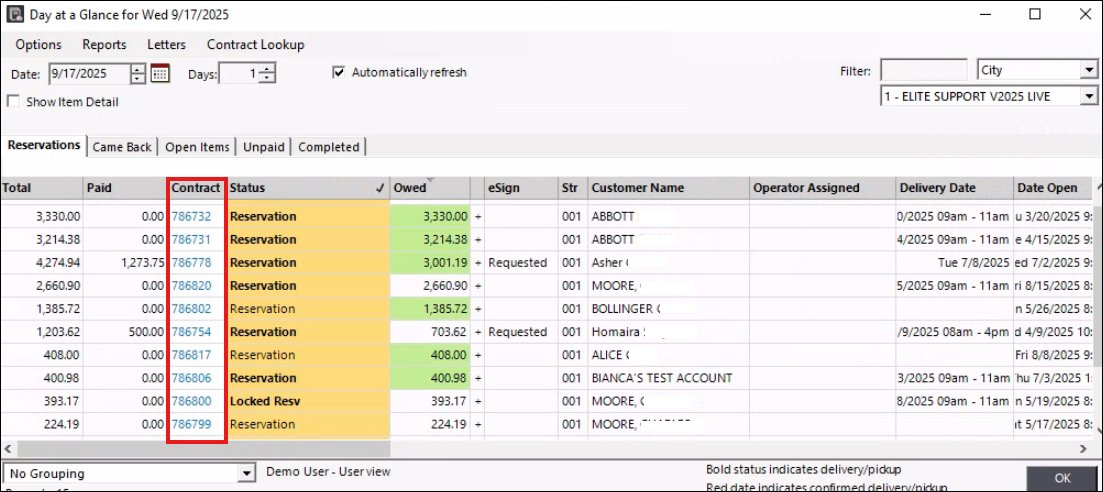 - Any contracts marked for delivery or pick up will have their contract status will be in bold.