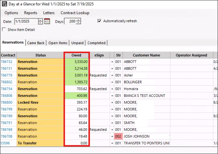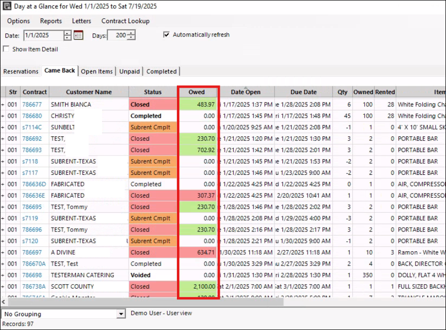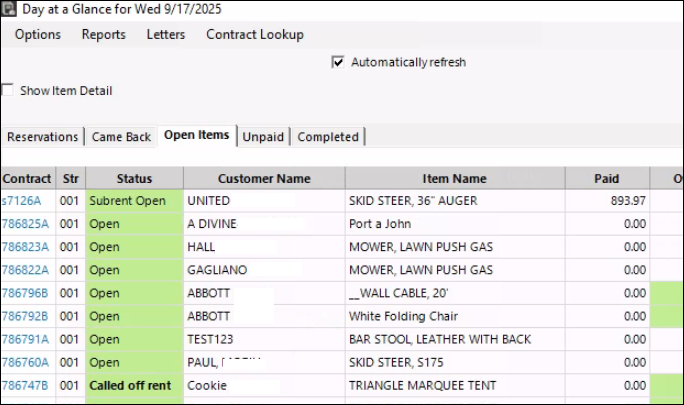 You can select any of the contracts by clicking on the contract number. If you click on the plus sign, all the items on that contract will be displayed. The customer record will be displayed if you click on the customer name. Any amounts due from an Account customer will be displayed in green. Any amounts that are due on a closed contract will be displayed in red. By clicking the “Show All Items” all the items on the contract will be displayed rather than just the first item.