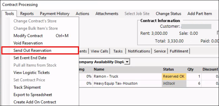 - In Elite, click on the contract number. Once the contract appears, a menu will open by default. Press Send Out Reservation.