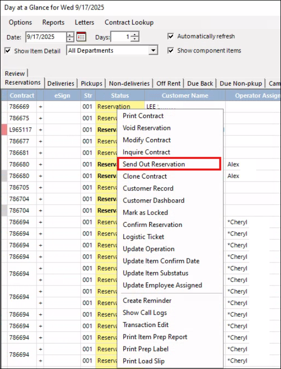 - In Expert, you can right-click your mouse and select Send out Reservations or click on the contract number to open any of the contracts.
