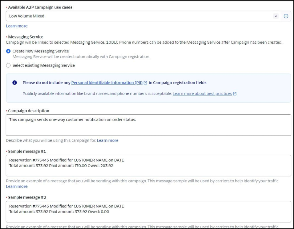- Low Volume Mixed ($1.50/month) is what they recommend for a mixed campaign use case to be used for sending messages of multiple uses, such as; customer care and delivery notifications. For those with those who do not need high throughput. Fill out fields for SMS messages sent