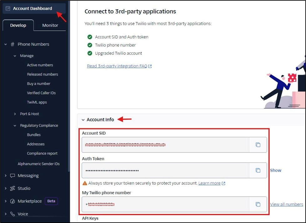 - From your Twilio Dashboard, copy the following values: