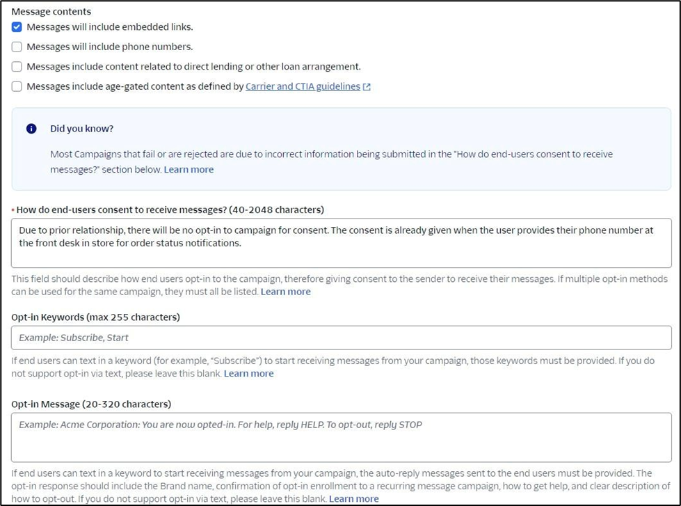 “Due to prior relationship, there will be no opt-in to campaign for consent. The consent is already given when the user provides their phone number at the front desk in store for order status notifications.”