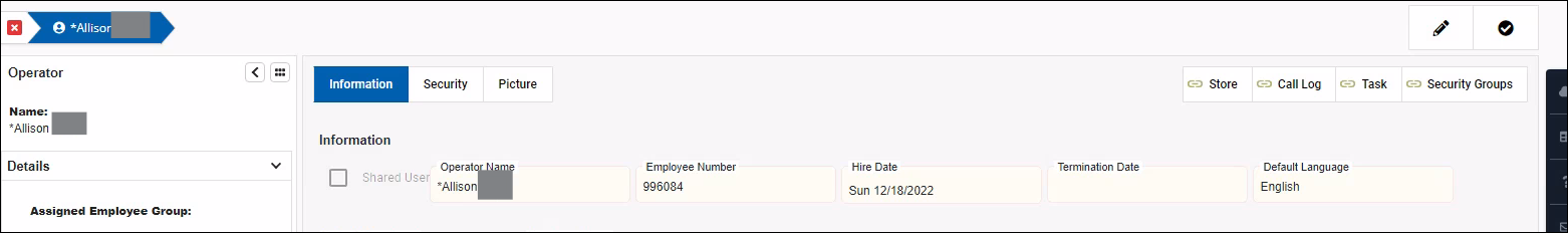 - To edit an Employee (or Shared Operator), click on the Name to bring up the operator, then click on the Pencil icon.