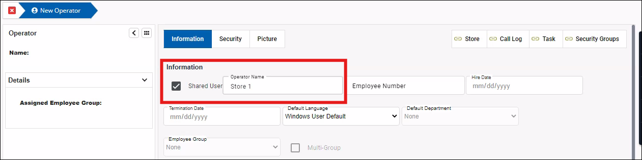 - To create a new Shared Operator, check the Shared User box in the Information tab. Only the Operator Name is required when this box is checked.
