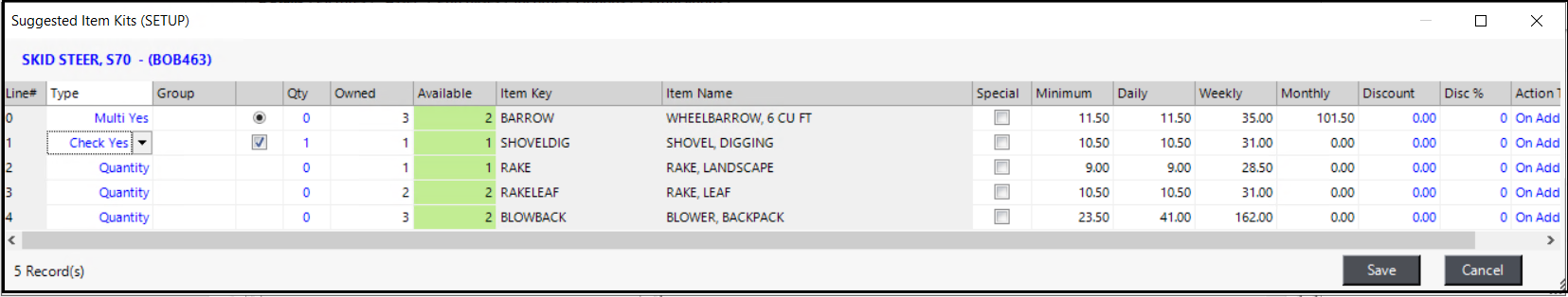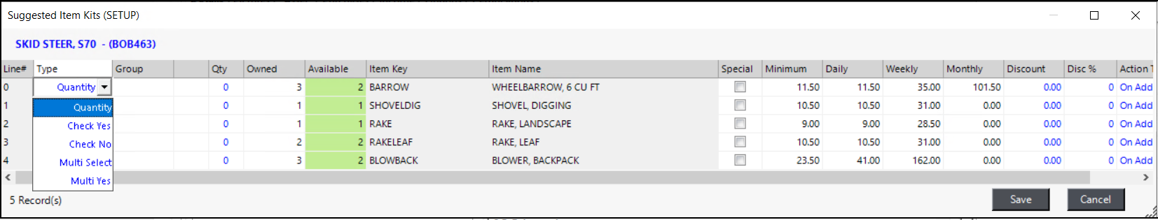 This example gives the customer a choice of a Smooth or Tooth Bucket or a set of Forks for free (Multi-Select). If they want additional items for a charge, they can choose from the options below (Check No). Since the quantity of Ear Protection can vary with each rental, it is left at Quantity, which the user can enter when writing the contract.