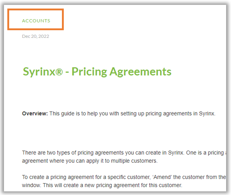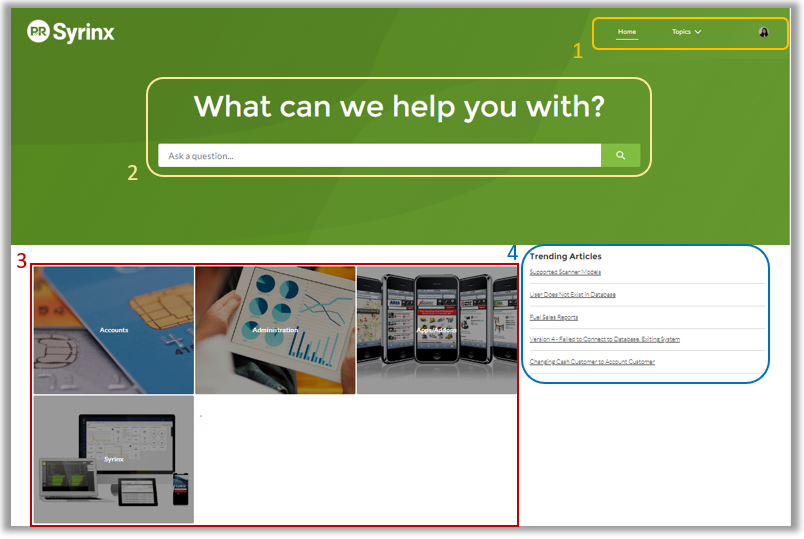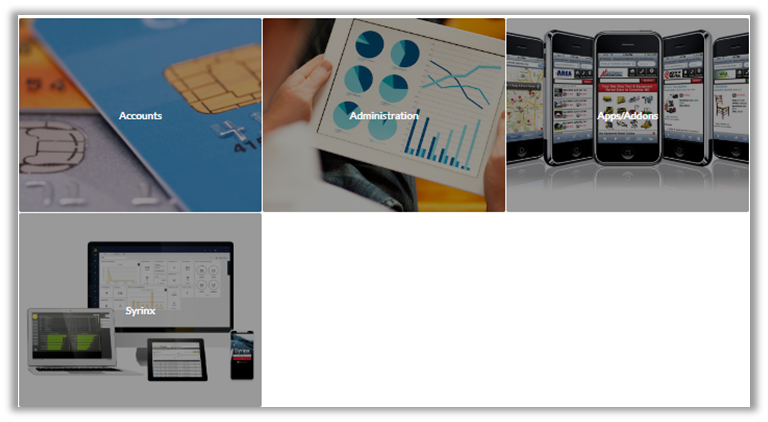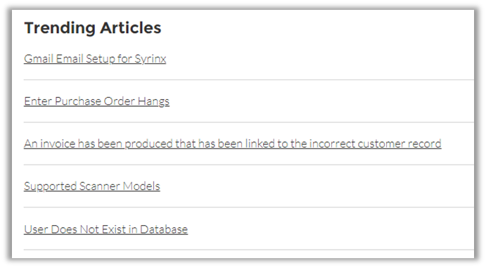 Use these options to browse through help articles or videos that relate to the topic. You can choose from Accounts, Administration, Apps/Addons, and Syrinx.