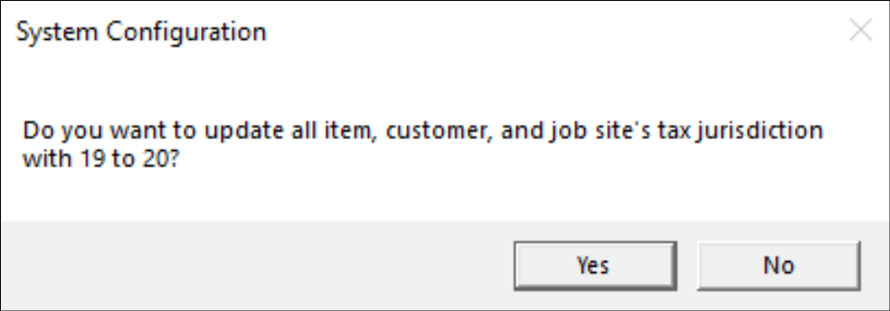 - A prompt will appear asking if you would like to update all items, customers, and job sites to the new tax jurisdiction. Select Yes.