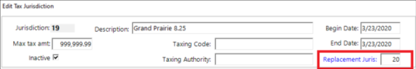 - If viewing the original tax jurisdiction, it will show the selected end date and the new jurisdiction number in the replacement jurisdiction.