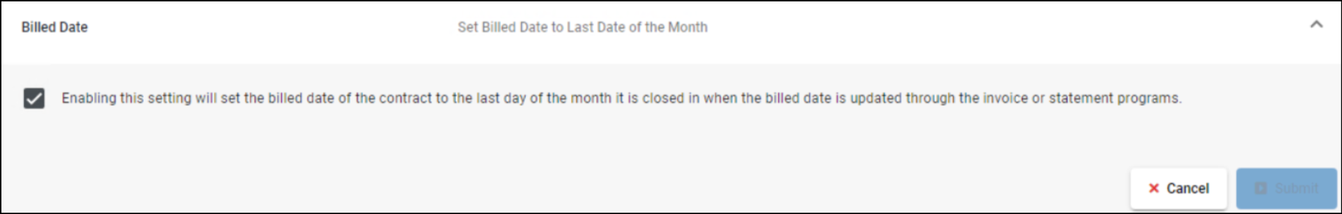 If the system uses the ‘Set Billed Date’ Configuration, then the terms days will use the billed date to calculate the due date on the invoice and the aging buckets in the Accounts Receivable Dashboard. This setting also sets the billed dates of all contracts to be the last day of the month they were closed in when run through print/fax/email invoices.
