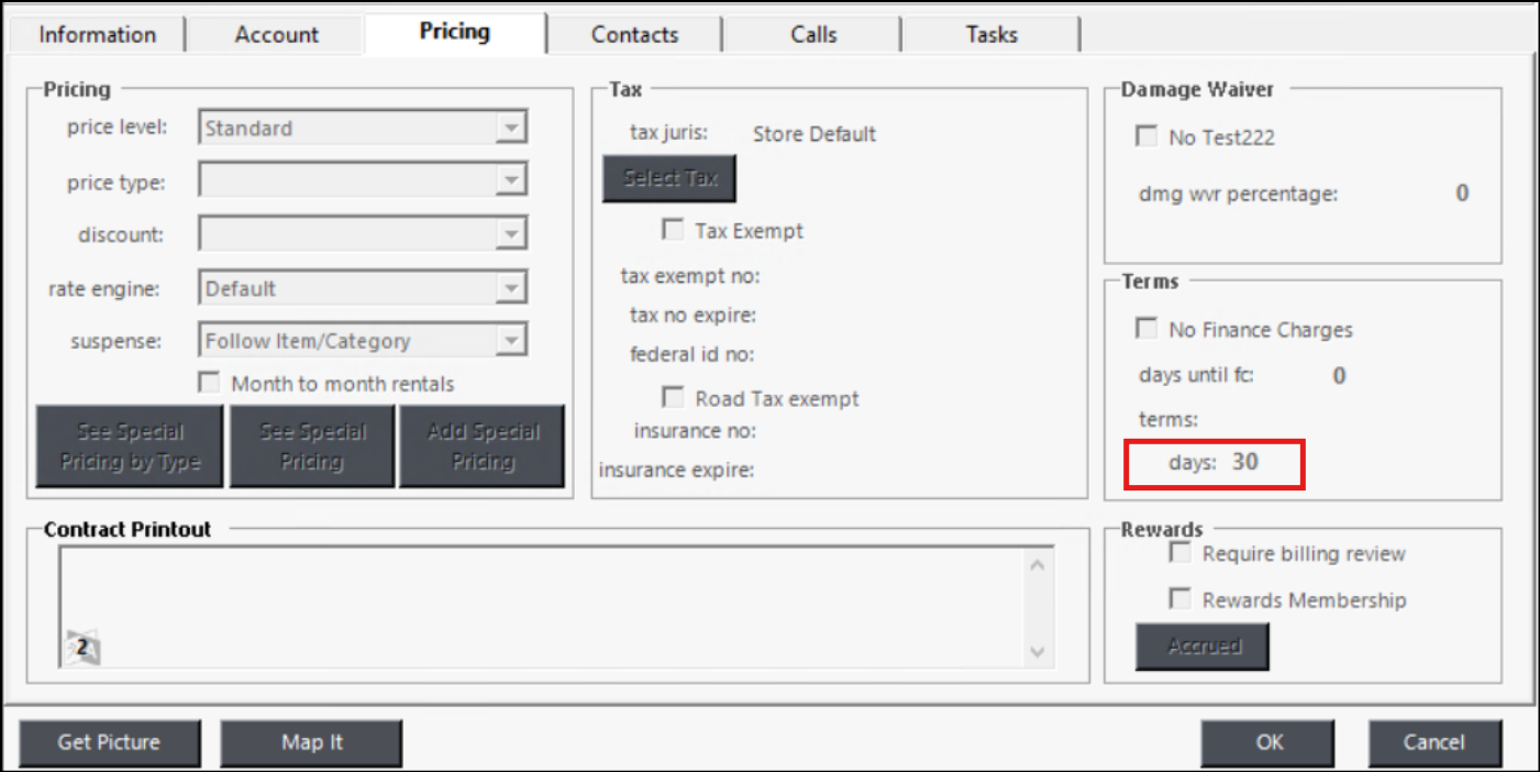 If the terms days field is being used, when the statement for an Account customer is generated, that numeric value will be shown in the Terms field. Cash customers will still receive the terms label message. Individual invoice dates listed on the statement reflect the closed dates of the contract.