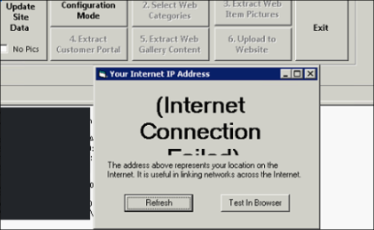- If you see a pop-up showing the message "(Internet Connection Failed)", you can ignore it and click on the "Test in Browser" button, which will open your browser and display your POR server's IP.