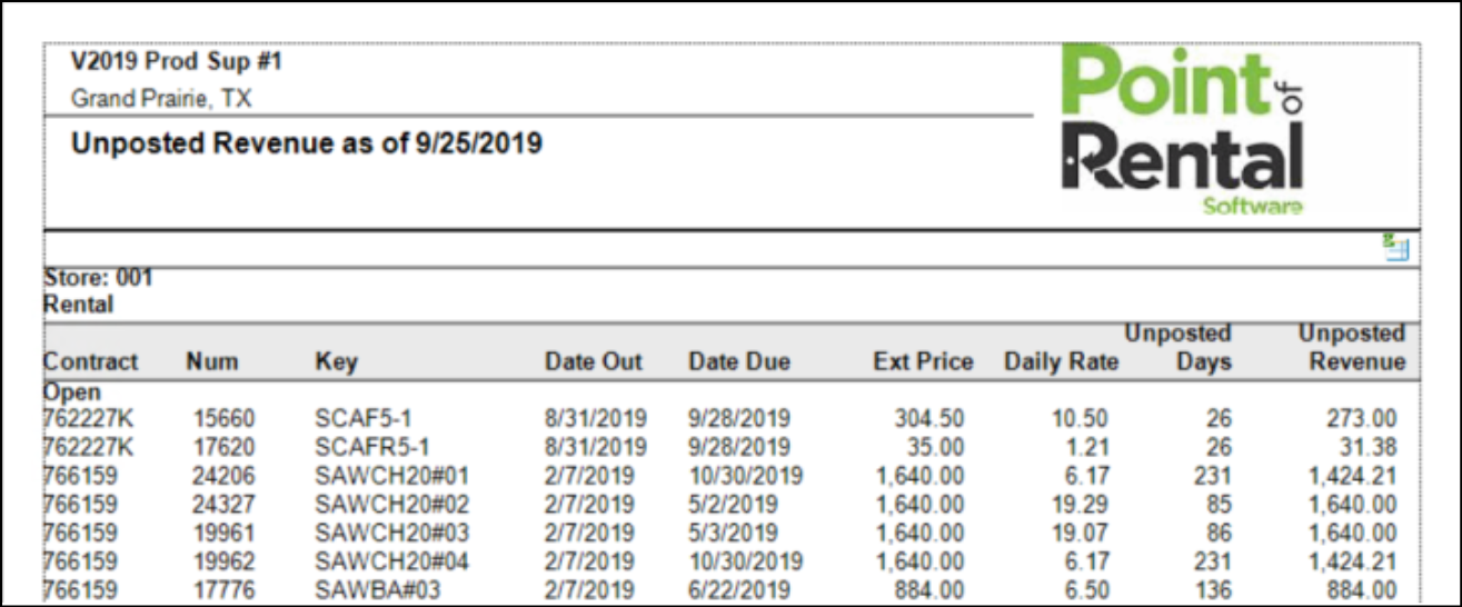 This report will list all contracts that are not in closed status on the date selected. This report is item-based and will report the value of the earned-to-date revenue for rental or sales based on the contract's date selection and item rate structure. It will list the item, contact number, date out, date due, Ext price, daily price, number of earned revenue days, and value of the earned revenue. Pre-billed (advance billed) contracts will not be reported if the contract's close date is before the selected report date.