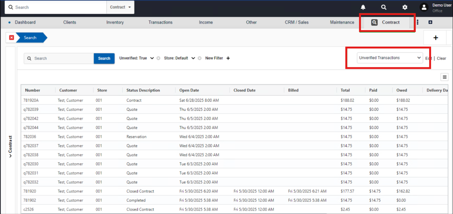 Open the view selector in the Contract Search screen and choose Unverified Transactions. This view is available by default and filters contracts based on the Unverified flag, which is automatically applied when a transaction is imported from Storefront.