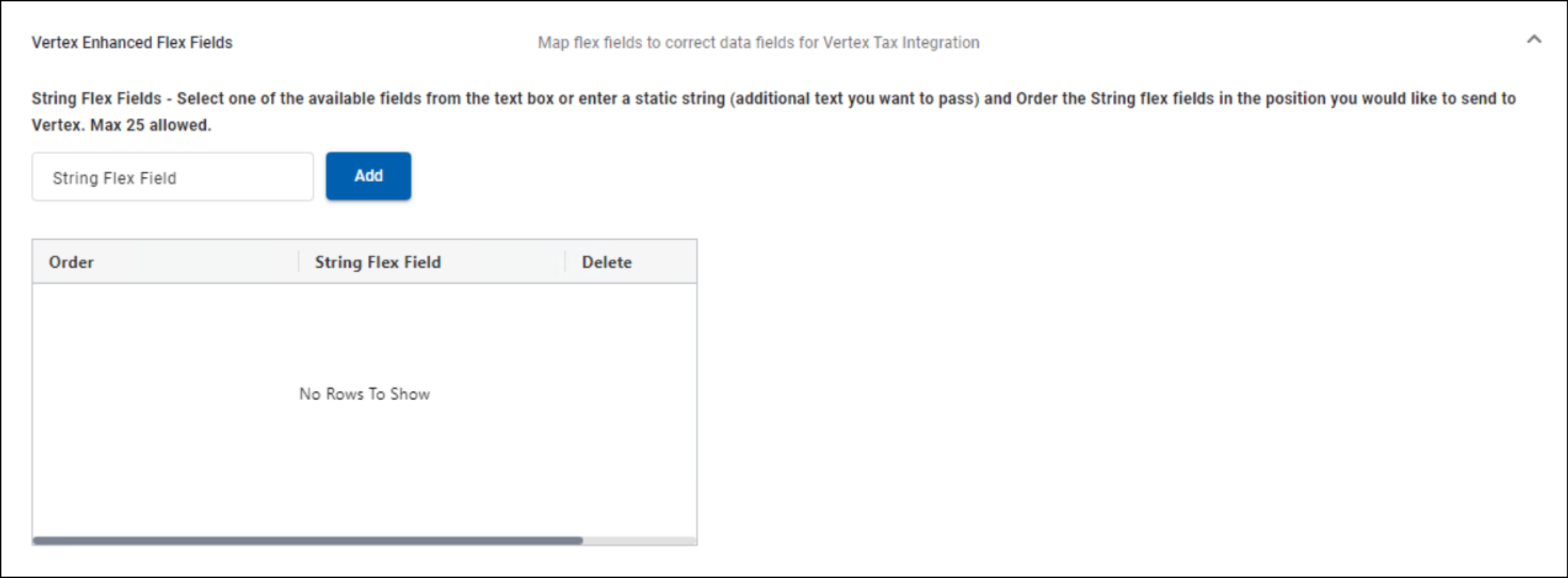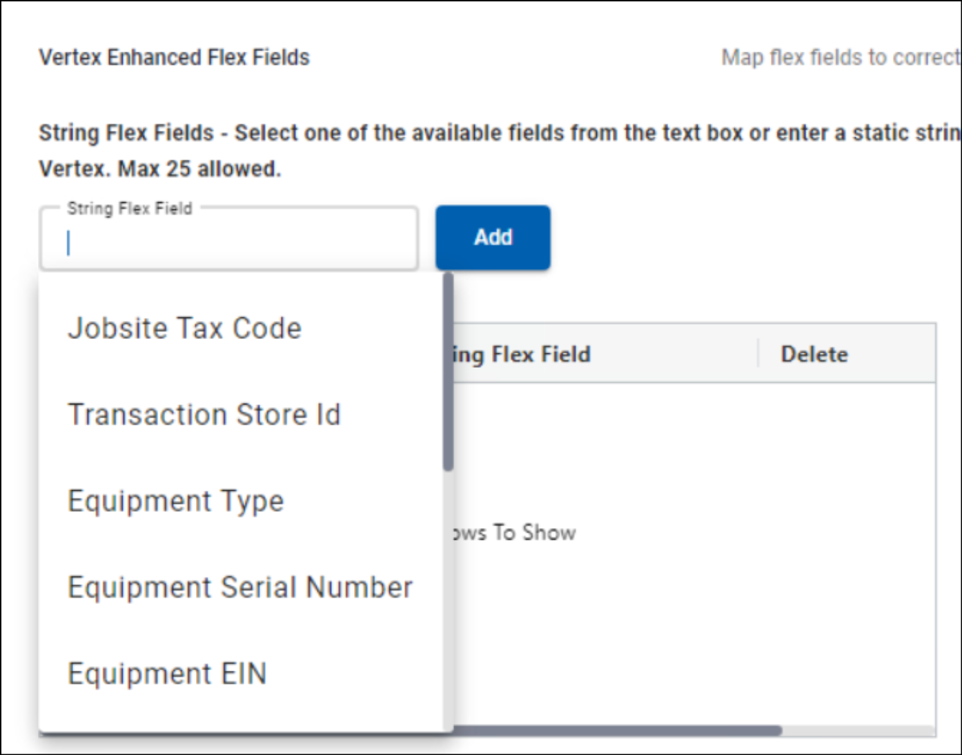 When using the string text field flex field input, you can also input text that is not in the drop-down as a field to be passed. This will not map to a data field. It simply passes over in Vertex as a form of transaction tagging. Below is a list of flex fields currently supported.
