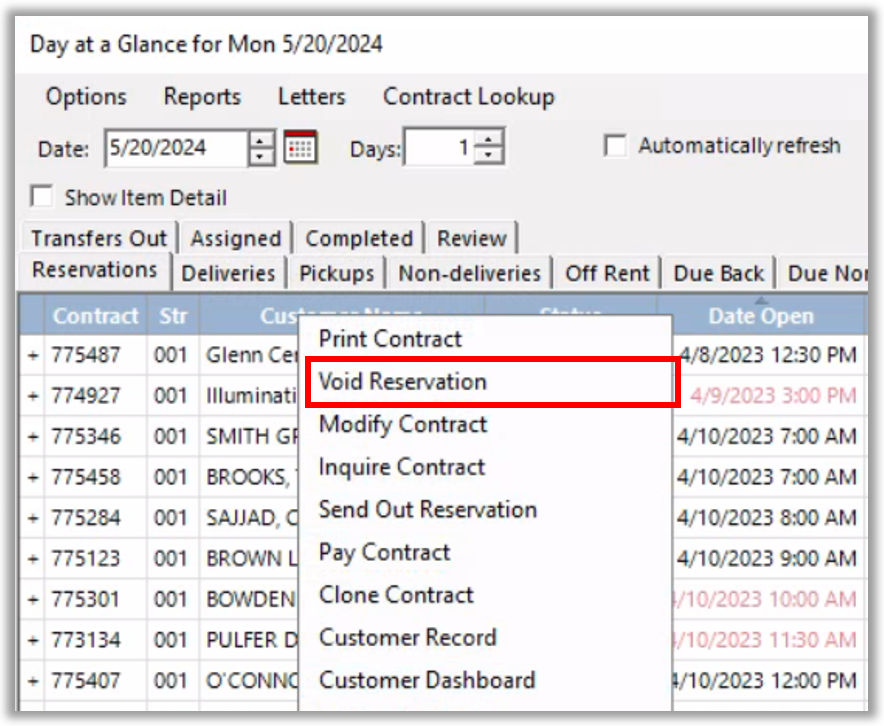 Canceling a reservation is simple. From the Reservation Tab in Day-at-a-Glance, you can right-click on the Reservation and choose Void Reservation.