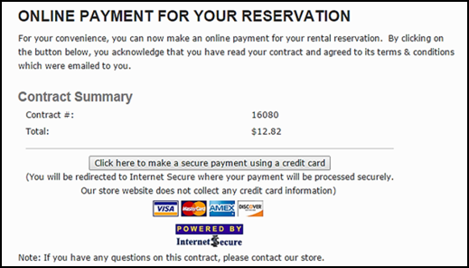 Web Payment Configuration/Setup enables you to accept payments via a webpage for Quotes and Reservations. With this feature, the rental store can generate an email with an embedded web payment link to a secure online payment page. Visit www.rentalhosting.com for more information and pricing.