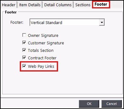 Select the ‘Footer’ tab and check the box ‘Web Pay Links.’