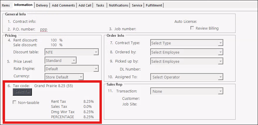 You can test the results of the import by creating a new contract, marking it for delivery, setting a delivery address, and then checking the tax rate on the contract within the Information tab.