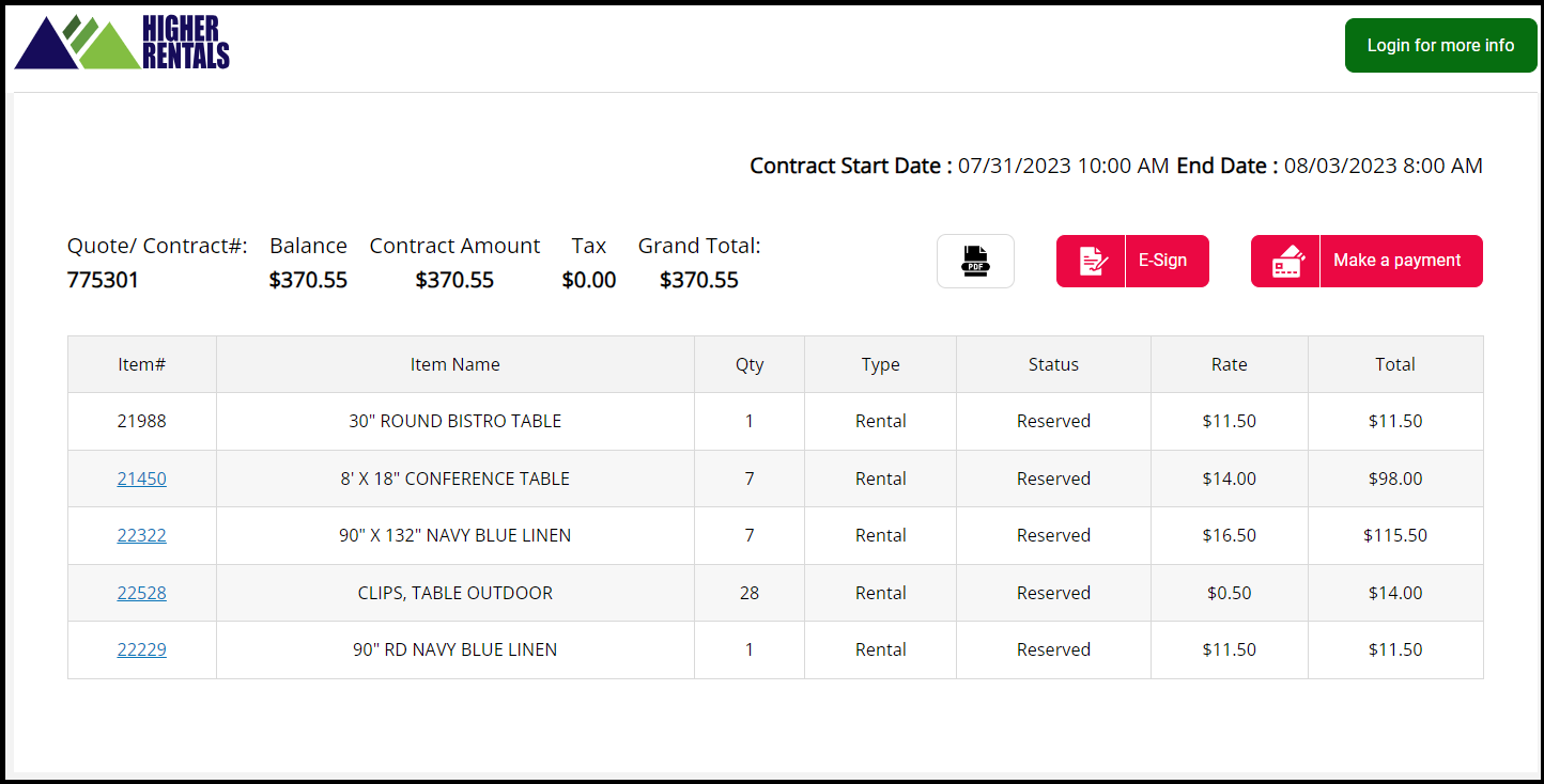 In your Day at a Glance, you will see the status change to “Requested” under the eSign column. Point of Rental will update the status hourly and change it from “Requested” to “On File,” when a signature is received. When you send out the Reservation, the “On File” status will carry over to the open contract.